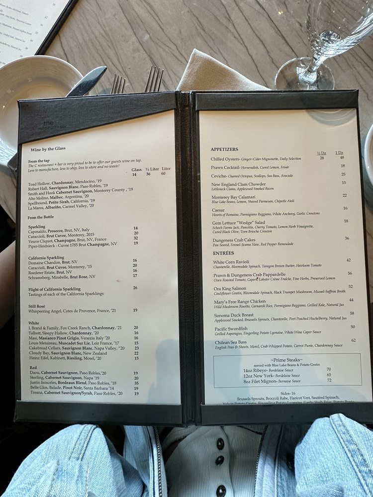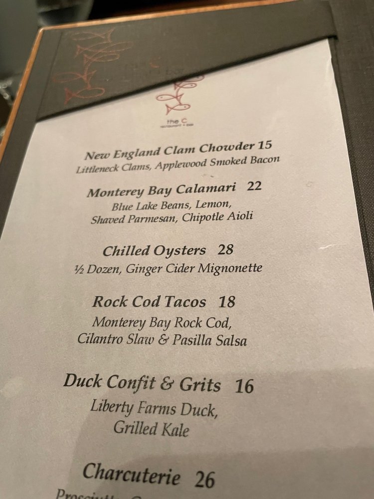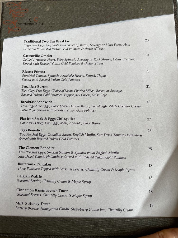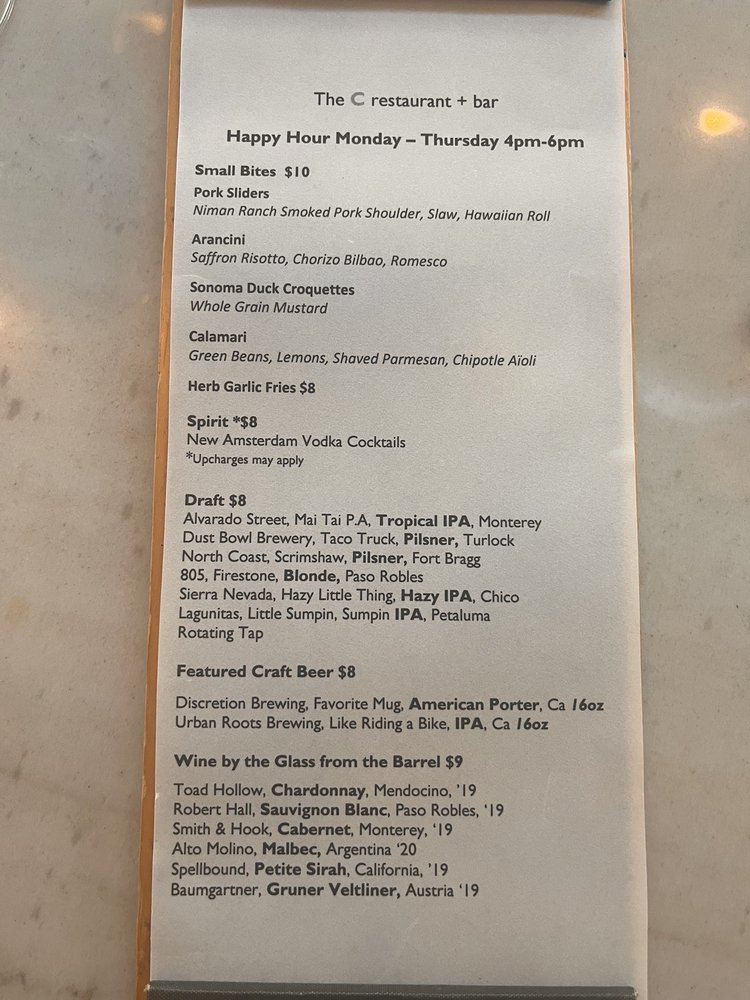 Introducing the menu at the C restaurant bar located in Monterey, CA. This upscale dining spot offers a variety of vegan options, limited vegetarian choices, and a menu suitable for breakfast, lunch, and dinner. With a full bar, happy hour specials, and a classy ambiance, it's the perfect place for a special night out. Customers rave about the impeccable customer service and delicious dishes like the Prawn and Dungeness crab Pappardelle and Ceviche. The scenic ocean view adds to the overall experience, making it a must-visit for both locals and tourists. Don't miss out on their cinnamon raisin French toast or Chef special beet and burrata salad. Whether you're looking for a romantic dinner or a family-friendly breakfast spot, the C restaurant bar has something for everyone.